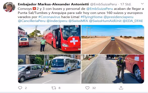Drei Bus-Konvois sind derzeit auf dem Weg durch Peru. Nachdem die ersten vier Busse bereits Cusco im Andenhochland im Osten Perus erreicht hat und von dort aus 130 Reisende aus der Schweiz und anderen europäischen Ländern nach Lima bringt, haben später auch der zweite und dritte Buskonvoi ihre Destinationen erreicht: In Punta Sal/Tumbes im Norden und in Arequipa im Süden des Landes nehmen die Busse etwa 160 Reisende auf. Weil die Reisemöglichkeiten im Land wegen der Massnahmen gegen die Ausbreitung des Coronavirus stark eingeschränkt sind, hat die Schweizer Botschaft den Landweg gewählt, um die Reisenden zu erreichen. Sie werden zum Flughafen von Lima gefahren. Dort ist am 31. März der Start des vom EDA gecharterten Flugzeugs vorgesehen. Am 1. April wird das Flugzeug der Fluggesellschaft Edelweiss in Zürich landen.
