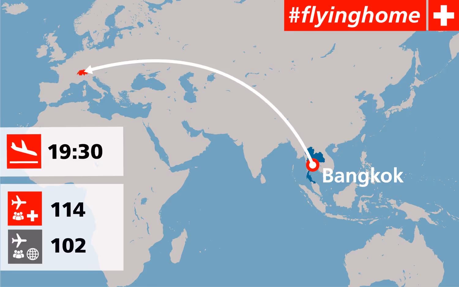 Am Dienstag um 19.30 Uhr landete ein Flug der Swiss aus Bangkok auf dem Flughafen Zürich. Das vom EDA gecharterte Flugzeug hatte 216 Passagiere an Bord, darunter 114 Schweizer Bürgerinnen und Bürger und 102 Angehörige anderer europäischer Länder. Dies ist die zweite vom EDA organisierte Rückführungsaktion aus Asien und die erste aus der thailändischen Hauptstadt.