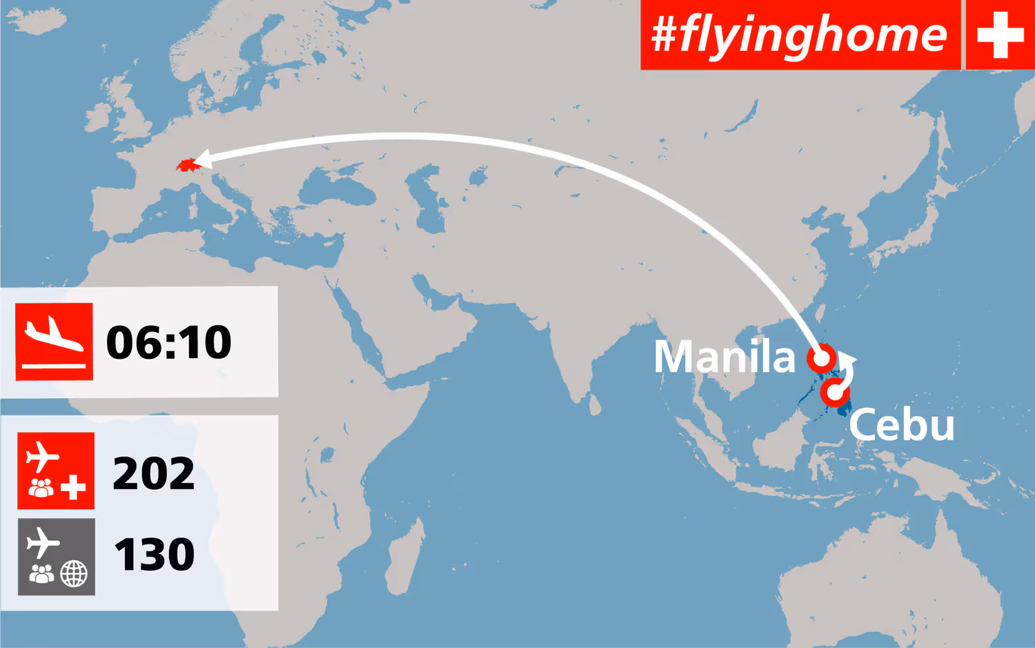 Die EDA-Rückholaktion gestrandeter Schweizerinnen und Schweizer dauert an. Zum ersten Mal wurden Personen aus dem asiatischen Kontinent heimgeholt. Von der philippinischen Provinz Cebu und der Hauptstadt Manila brachte am frühen Montagmorgen ein Flugzeug 332 Passagiere nach Zürich. Es handelte sich dabei um 202 Schweizer Reisende sowie um 130 ausländische Staatsangehörige, von denen 25 in der Schweiz wohnen.