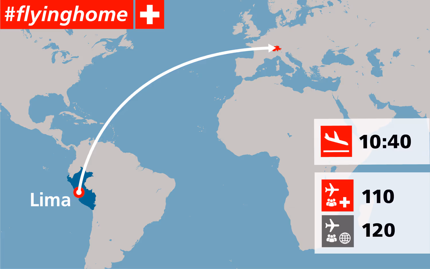 Le deuxième vol de retour de Lima, organisé par le DFAE dans le cadre de sa campagne de retour, a eu lieu. Mercredi matin, un avion de la compagnie aérienne Edelweiss a atterri à Zurich. Il y avait 266 voyageurs suisses et 33 passagers d'autres pays européens. Beaucoup d'entre eux ont été transporté à Lima à l’aide de bus en provenance de plusieurs villes du nord, du sud et de l'est du Pérou. L'ambassade de Suisse a organisé ces convois de bus en raison des mesures prises pour empêcher la propagation du COVID-19 qui ont fortement limité les possibilités de déplacement dans le pays.