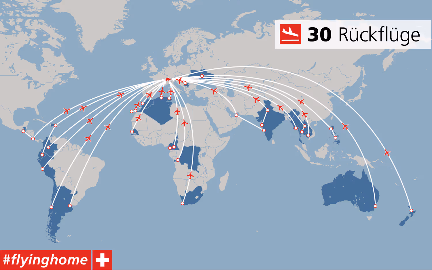La diplomatie suisse a d’ores et déjà permis le retour de 3700 personnes grâce à 16 vols spéciaux organisés par le DFAE, en provenance de tous les continents. Par ces vols, 2100 ressortissants suisses et 1600 ressortissants étrangers sont rentrés. Grâce aux contacts et aide mutuelle, plus de 800 Suisses ont été rapatriés sur des vols organisés par d’autres pays.