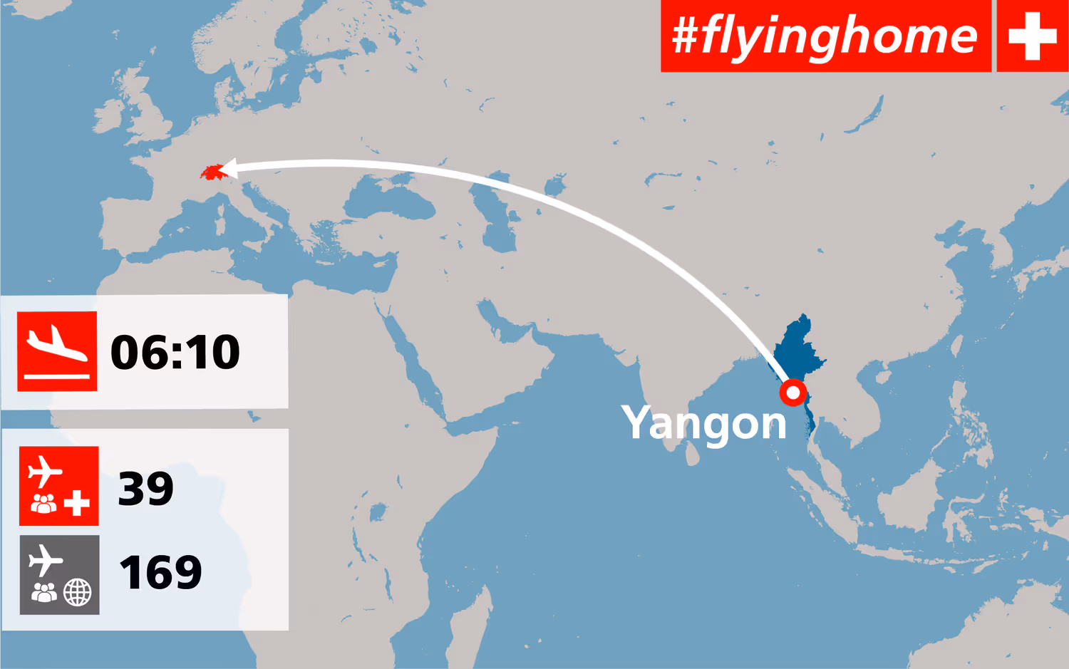 Au total, le DFAE a organisé 6 vols retour depuis l’Asie. 3 en provenance de Thaïlande, 1 du Myanmar, 1 des Philippines et 1 du Cambodge. Cette liaison est la 21e organisée dans le cadre de la stratégie retour du DFAE.