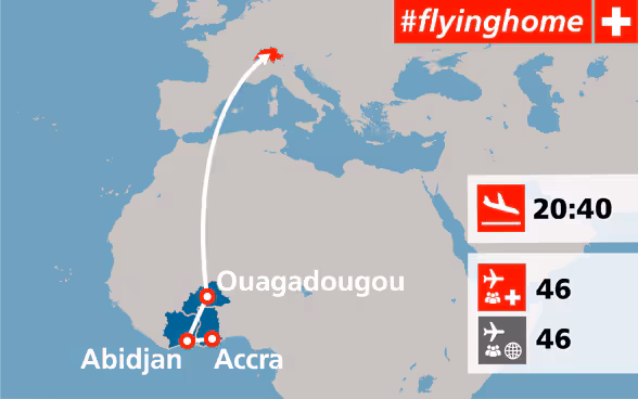 Le vol de Yaoundé, avec à son bord 268 passagers de la Suisse et d’autres pays européens, a atterri à Zurich. Le vol a transité par Douala, la capitale économique du Cameroun, où il a également pu prendre plusieurs passagers. Le vol a pu voir le jour grâce à la collaboration entre le centre de crise du DFAE, l’ambassade suisse du Cameroun et la compagnie aérienne Edelweiss. Il s’agit du second vol en provenance d’Afrique subsaharienne.
