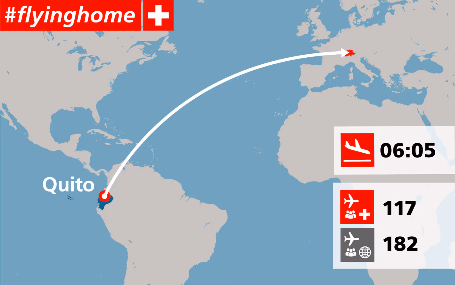 Le vol en provenance de Quito, capitale de l'Équateur, avec à son bord 117 passagers suisses et 182 passagers d’autres pays européens, a atterri ce vendredi à Zurich. Il s’agit du sixième vol venant d’Amérique du Sud organisé par le DFAE après Lima (deux vols), Bogotá, Santiago du Chili et Buenos Aires. Le vol a pu voir le jour grâce à la collaboration entre le centre de crise du DFAE, l’ambassade suisse à Quito et la compagnie aérienne Edelweiss.
