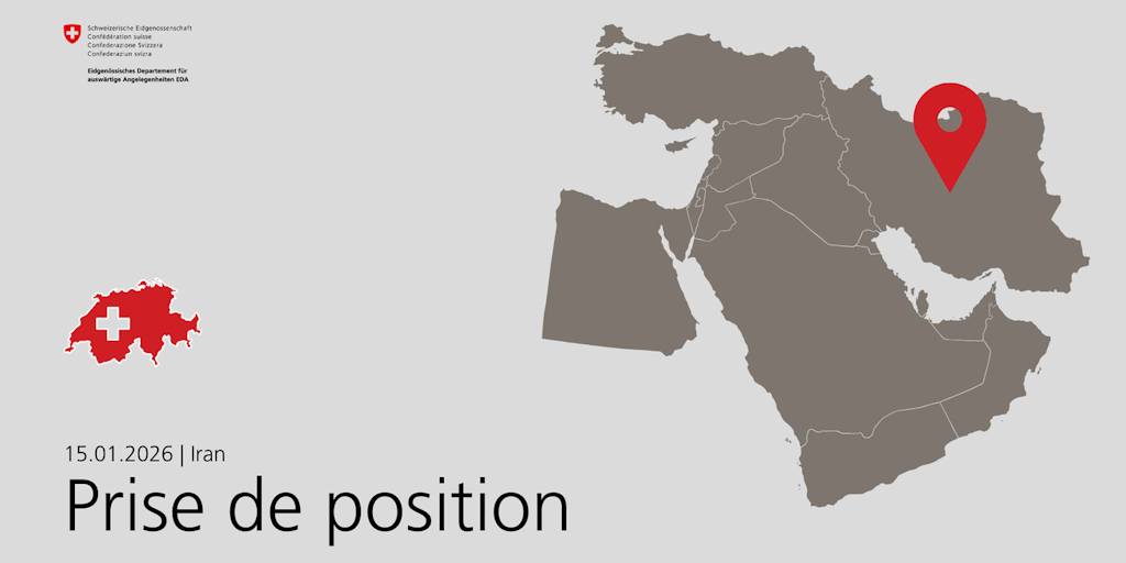 La Suisse suit avec une grande inquiétude la situation en Iran et appelle les autorités iraniennes à mettre fin à la violence contre les manifestants et à garantir les droits humains et les libertés fondamentales de tous les protestataires. Lors d'une rencontre avec l'ambassadeur iranien en Suisse le 15 janvier 2026, l'ambassadrice Monika Schmutz Kirgöz, cheffe de la division Moyen-Orient et Afrique du Nord du DFAE, a officiellement protesté concernant le recours excessif à la violence par les autorités iraniennes à l'encontre des manifestants.