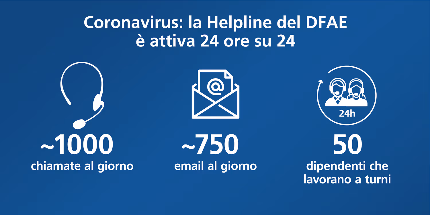 Nel contesto delle operazioni di rimpatrio dei viaggiatori svizzeri, dal 19 marzo la Helpline del DFAE ha ricevuto oltre 10'000 telefonate e più di 10'000 e-mail. Per poter rispondere a tutte le richieste, il numero di collaboratori è passato da 13 a circa 80 persone, che sostengono la Helpline a tempo parziale tramite trasferimenti interni al DFAE. Questi dati sono stati resi noti da Johannes Matyassy, direttore della Direzione consolare (DC), in occasione di una conferenza stampa della Confederazione. Molte domande vengono trasmesse agli uffici competenti, ad esempio all'Ufficio federale della sanità pubblica o alla Segreteria di Stato per la migrazione.