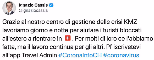 Il DFAE è consapevole del fatto che, in molti luoghi, ci sono ancora moltissimi turisti o viaggiatori svizzeri bloccati. «Vorrei ringraziare queste persone per la loro comprensione e per la pazienza che devono dimostrare, quando il rimpatrio non è possibile immediatamente», ha sottolineato il direttore della DC. L'organizzazione di un volo di ritorno richiede un grosso lavoro logistico e anche politico. «Le rappresentanze svizzere all'estero si stanno impegnando a fondo per aprire la via ai rimpatri», ha dichiarato Johannes Matyassy.