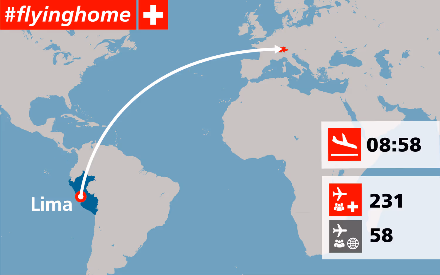 Dopo San José, Casablanca e Bogotá, giovedì si è concluso il quarto volo dell’operazione di rimpatrio del DFAE: giovedì mattina presto, un aereo noleggiato dal DFAE è atterrato a Zurigo da Lima con 289 passeggeri a bordo. Tra questi vi erano 231 cittadini svizzeri, 56 persone residenti e due passeggeri di altri Paesi europei. L'Ambasciata svizzera ha aiutato molti viaggiatori bloccati in Perù a raggiungere l'aeroporto di Lima, nonostante la mobilità limitata. Il personale dell'ambasciata si è occupato dei passeggeri fino al momento del decollo per la Svizzera.