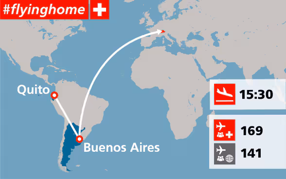 Il volo da Quito, capitale dell'Ecuador, con a bordo 117 passeggeri di cittadinanza elvetica e 182 passeggeri di altri Paesi europei, è atterrato a Zurigo venerdì. Si tratta del sesto volo dal Sud America organizzato dal DFAE, dopo due voli da Lima e uno da Bogotà, Santiago del Cile e Buenos Aires. Il volo è stato reso possibile grazie alla collaborazione tra il centro di crisi del DFAE, l'Ambasciata di Svizzera a Quito e la compagnia aerea Edelweiss.