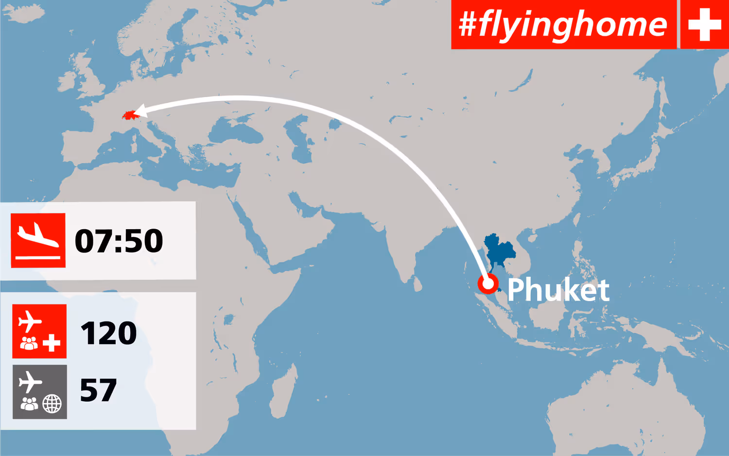 Venerdì mattina un aereo Edelweiss, con a bordo 120 passeggeri di cittadinanza elvetica e 57 passeggeri di altri Paesi europei, è atterrato a Zurigo. Si è trattato del secondo volo dalla Tailandia nell'ambito dell'operazione di rimpatrio del DFAE. Un terzo volo è previsto per il 5 aprile 2020, proveniente da Bangkok.