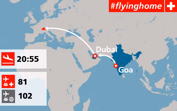 Il 20esimo volo dell'operazione di rimpatrio su larga scala del DFAE è atterrato a Zurigo domenica alle 20.45. Il volo operato da Edelweiss e in partenza da Goa, in India, ha fatto scalo a Dubai prima di ripartire per la Svizzera. A bordo c'erano 81 cittadini svizzeri e 102 passeggeri provenienti da altri Paesi europei.