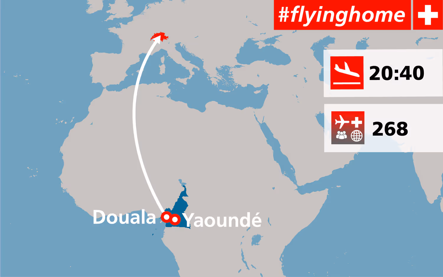 Le vol de Yaoundé, avec à son bord 268 passagers de la Suisse et d’autres pays européens, a atterri à Zurich. Le vol a transité par Douala, la capitale économique du Cameroun, où il a également pu prendre plusieurs passagers. Le vol a pu voir le jour grâce à la collaboration entre le centre de crise du DFAE, l’ambassade suisse du Cameroun et la compagnie aérienne Edelweiss. Il s’agit du second vol en provenance d’Afrique subsaharienne.