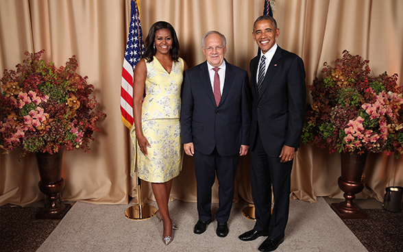 Bundespräsident Johann N. Schneider-Ammann posiert neben dem US-Präsidentenpaar Michelle und Barack Obama. © US White house