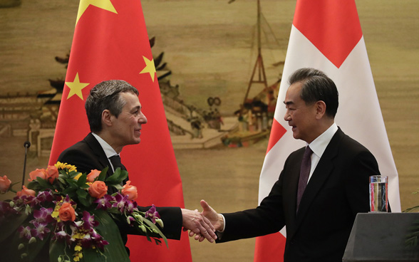 Le ministre suisse des affaires étrangères Ignazio Cassis serre la main du conseiller d'Etat et ministre des affaires étrangères chinois, Wang Yi, après leur conférence de presse commune à Pékin, le 3 avril 2018. © Keystone