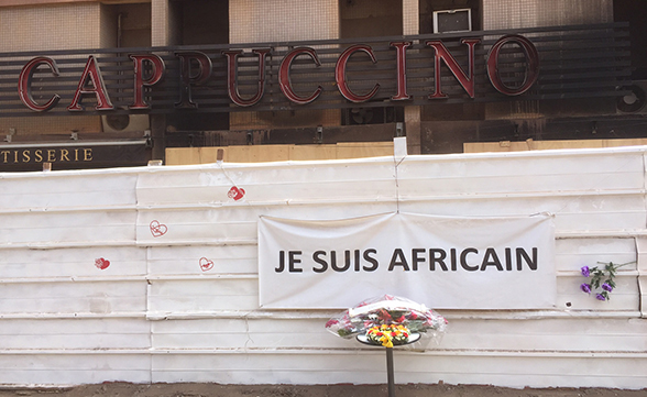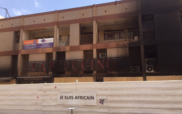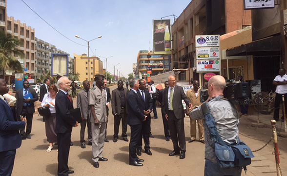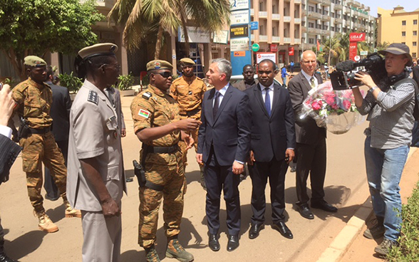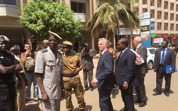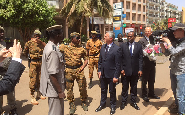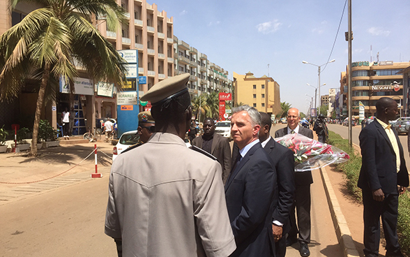 Le conseiller fédéral Didier Burkhalter sur les lieux de l’attentat de Ouagadougou, au Burkina Faso. © DFAE